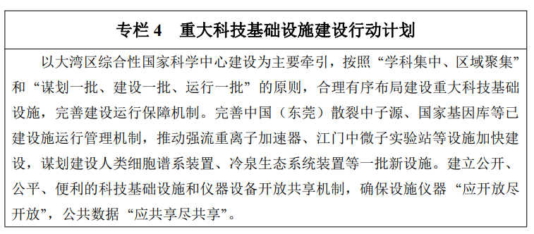 围绕国家战略需求,以大湾区综合性国家科学中心建设为主要牵引,按照“学科集中、区域聚集”和“谋划一批、建设一批、运行一批”的原则,聚焦信息、生命、材料、海洋、能源等重点学科领域,合理有序布局建设重大科技基础设施集群。在信息科学领域,推动国家超级计算广州中心、深圳中心扩容升级,加快建设未来网络实验装置(深圳)、鹏城云脑智能超级算力平台、珠海智能超算平台等。在生命科学领域,加快建设国家基因库二期、合成生物研究重大科技基础设施、脑解析与脑模拟重大科技基础设施等,谋划建设人类细胞谱系装置、精准医学影像大设施等。在材料科学领域,加快建设中国(东莞)散裂中子源二期,谋划建设先进阿秒激光设施、南方先进光源装置等。在海洋科学领域,加快建设新型地球物理综合科学考察船、天然气水合物钻采船,谋划建设冷泉生态系统装置、极端海洋动态过程多尺度自主观测科考设备、海底科学观测网南海子网等。在能源科学领域,加快建设强流重离子加速器、加速器驱动嬗变研究装置等。在基础物理领域,加快建设江门中微子实验站等。在航空航天领域,推进智能化动态宽域高超声速风洞建设。完善重大科技基础设施管理运营和开放共享机制,推动各类创新主体依托重大科技基础设施开展技术研发、成果转化及产业化。