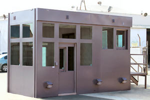 美國(guó)BIGEnterprises,Inc公司新開發(fā)了一種雙層的、可應(yīng)對(duì)極端天氣情況的崗?fù)ぃ饕糜谶吘硻z查站。該崗?fù)け痪薮蟮膰鷫Νh(huán)繞,在極端天氣情況下檢查過往的卡車或是其他交通工具。警衛(wèi)站在崗?fù)?nèi),可以直接通過目光檢查地面上通過的車輛,而不需要走到崗?fù)ね饷嫒。該設(shè)施具有很強(qiáng)的防彈性能,并配置了多種供電設(shè)施以支持報(bào)警、攝像監(jiān)控和其他通信功能。崗?fù)ろ敳垦b有空調(diào)系統(tǒng),同時(shí)輔助有備用加熱和地板加熱裝置。